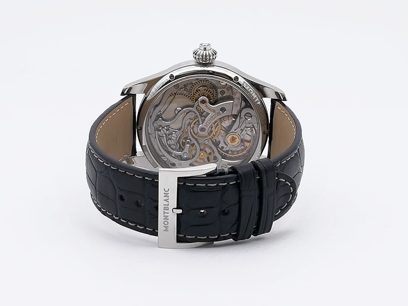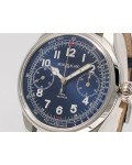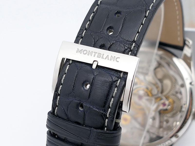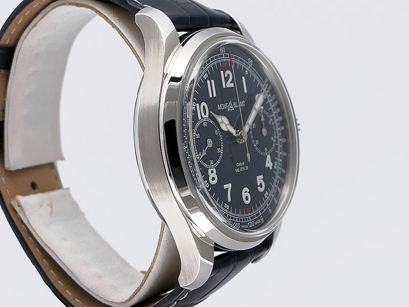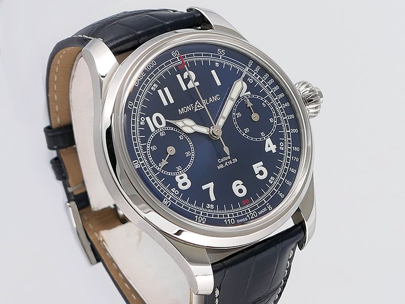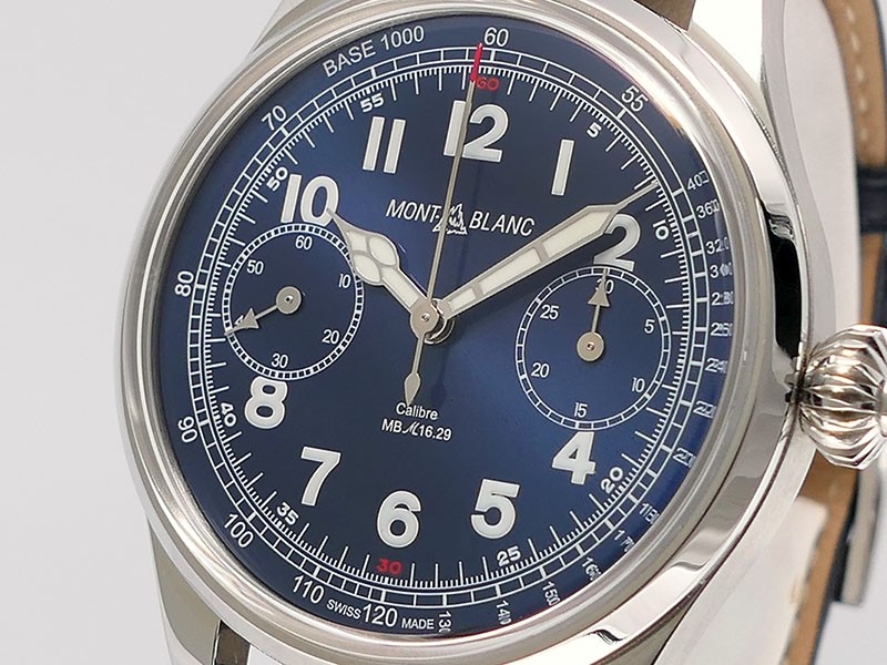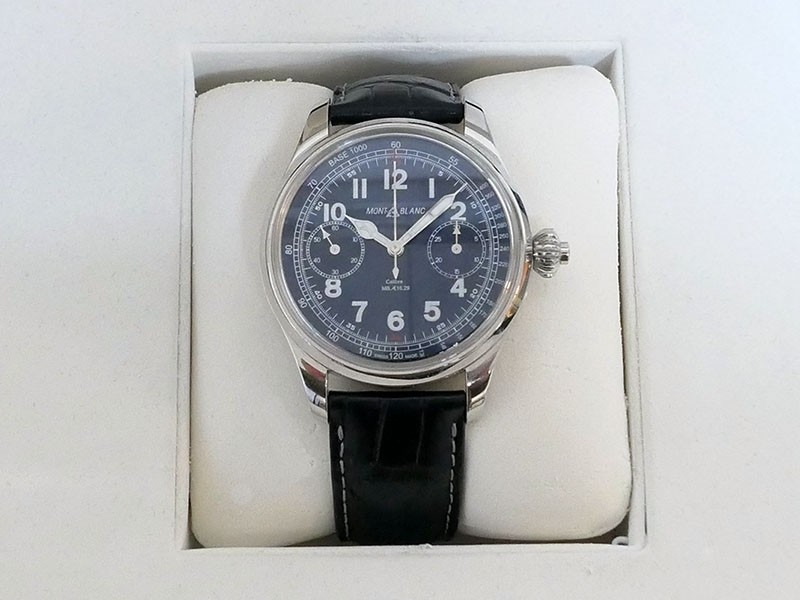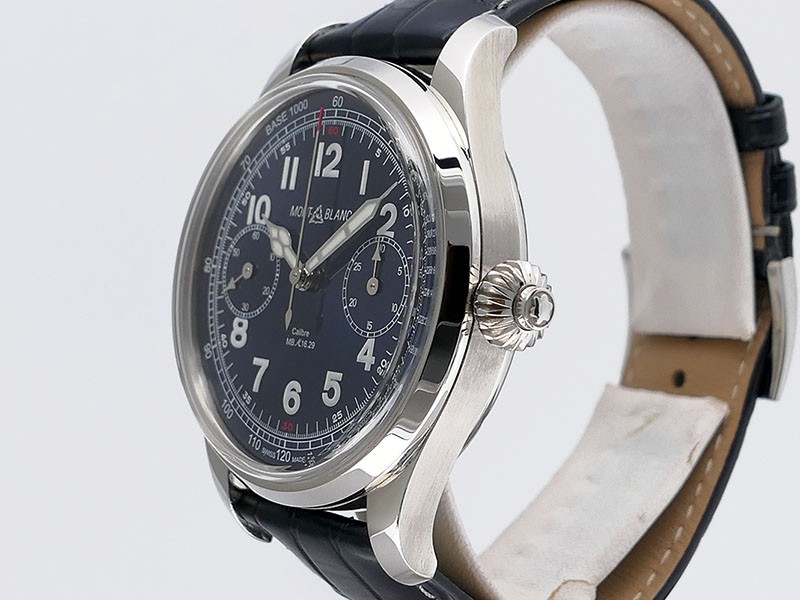 Swiss made Montblanc 1858 Chronograph Monopusher Minerva Stainless Steel round shaped case, reserve to ± 50h.Cobalt Blue dial with Blue leather strap with Montblanc Tang steel buckle... limited to 100 pieces...| Brand | MontBlanc |