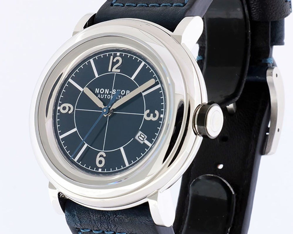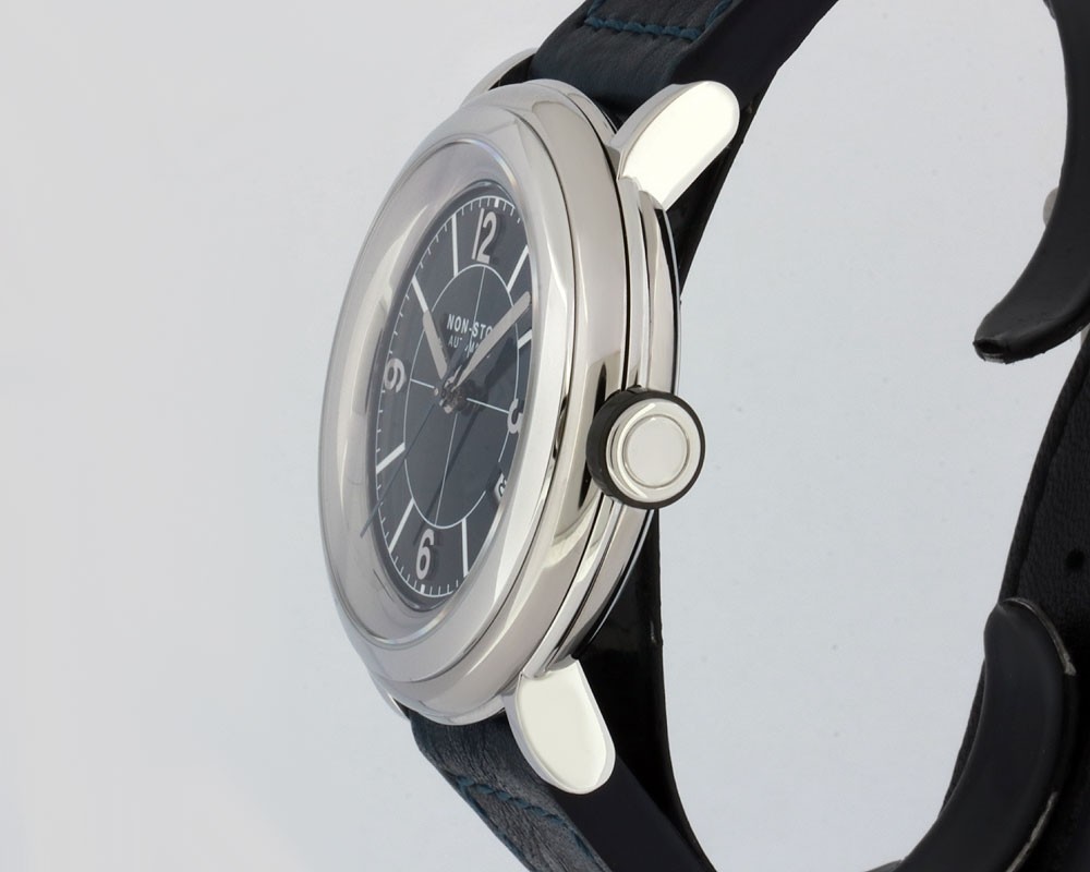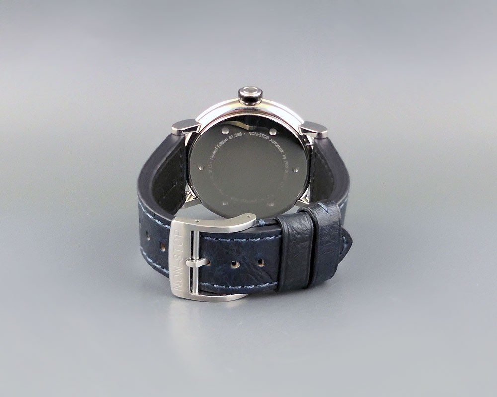 Non-Stop Watches Circle Silver Navy SNSS T5 Surgical Titanium round shaped case, reserve up to ± 40hours. Navy dial, date. Blue Italian leather quick release strap with Non-Stop Tang buckle, plus 2nd rubber strap.| Brand | Non-Stop Watches |