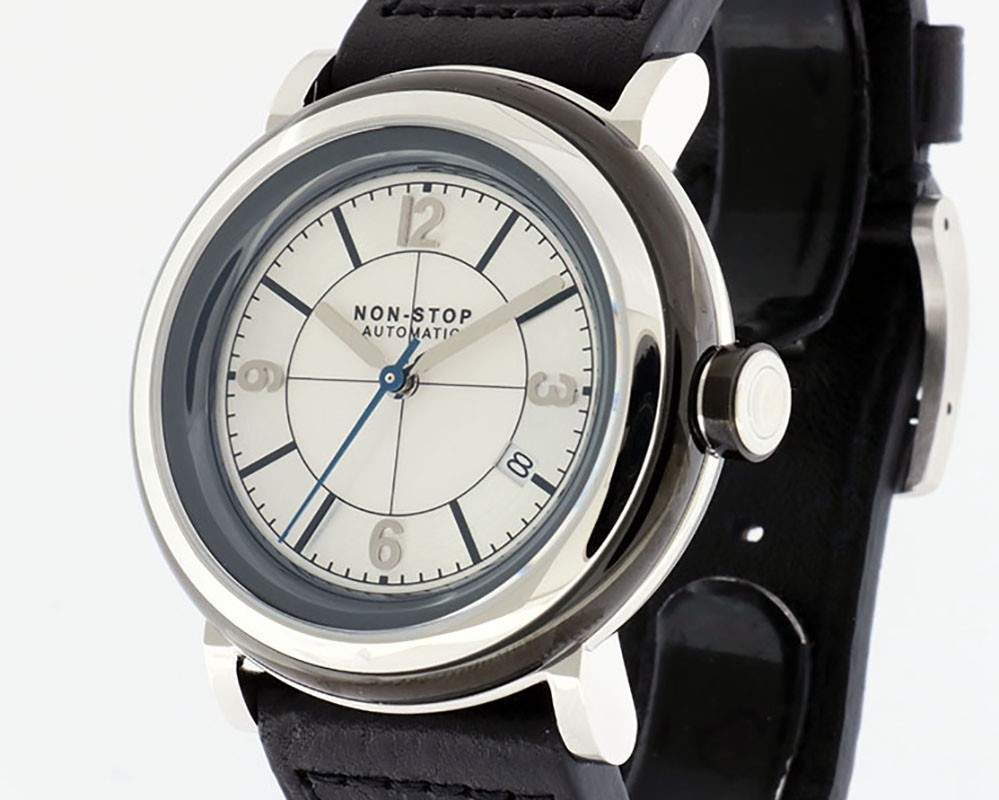 Non-Stop Watches Circle Black Silver BSSS T5 Surgical Titanium round shaped case, reserve up to ± 40hours. Silver dial, date. Black Italian leather quick release strap with Non-Stop Tang buckle, plus 2nd rubber strap.| Brand | Non-Stop Watches |