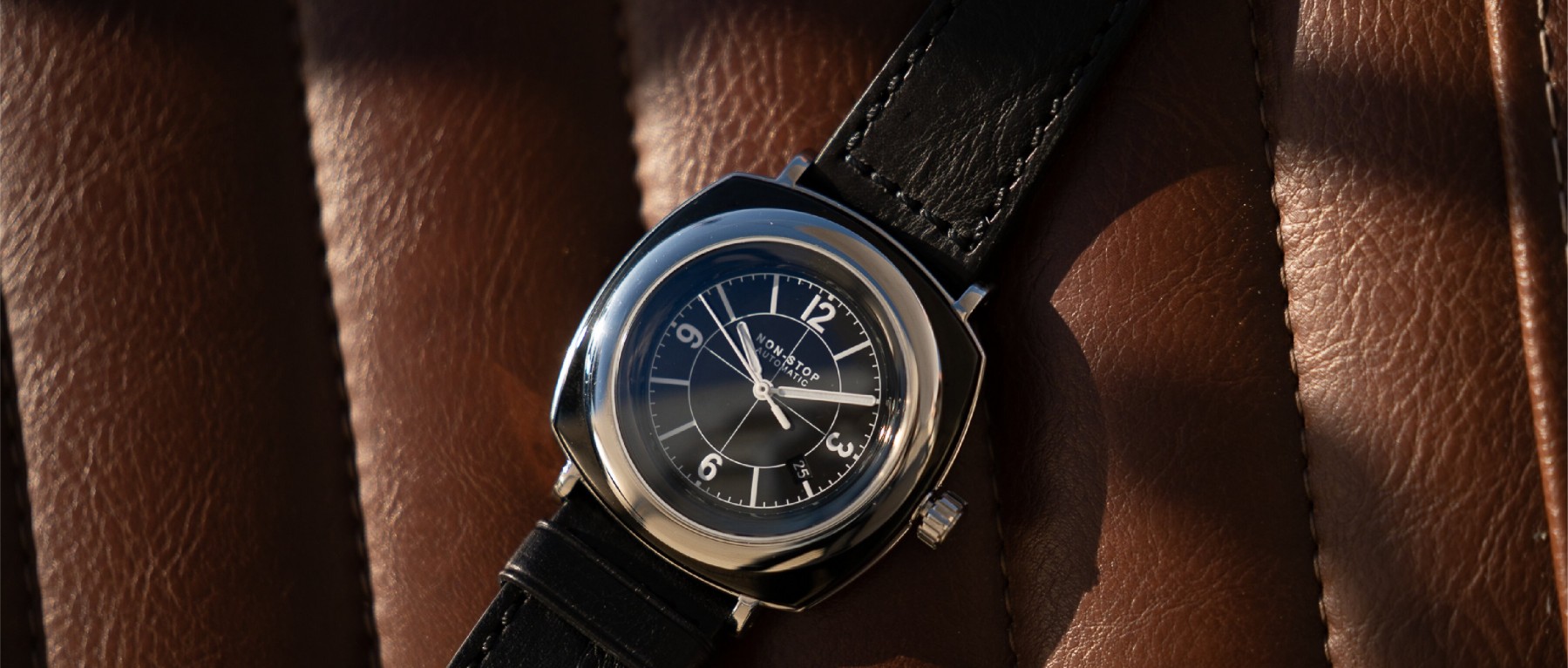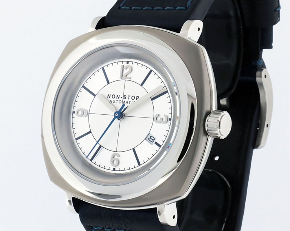 Non-Stop Watches Cushion Silver Silver SSSS Silver T5 Surgical Titanium Cushion shaped case, reserve up to ± 40hours. Silver dial, date. Blue Italian leather quick release strap with Non-Stop Tang buckle, plus 2nd rubber strap.| Brand | Non-Stop Watches |