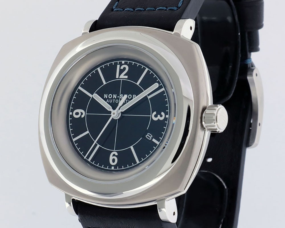 Non-Stop Watches Cushion Silver Black SBWW, Silver T5 Surgical Titanium Cushion shaped case, reserve up to ± 40hours. Black dial, date. Blue Italian leather quick release strap with Non-Stop Tang buckle, plus 2nd rubber strap.| Brand | Non-Stop Watches |