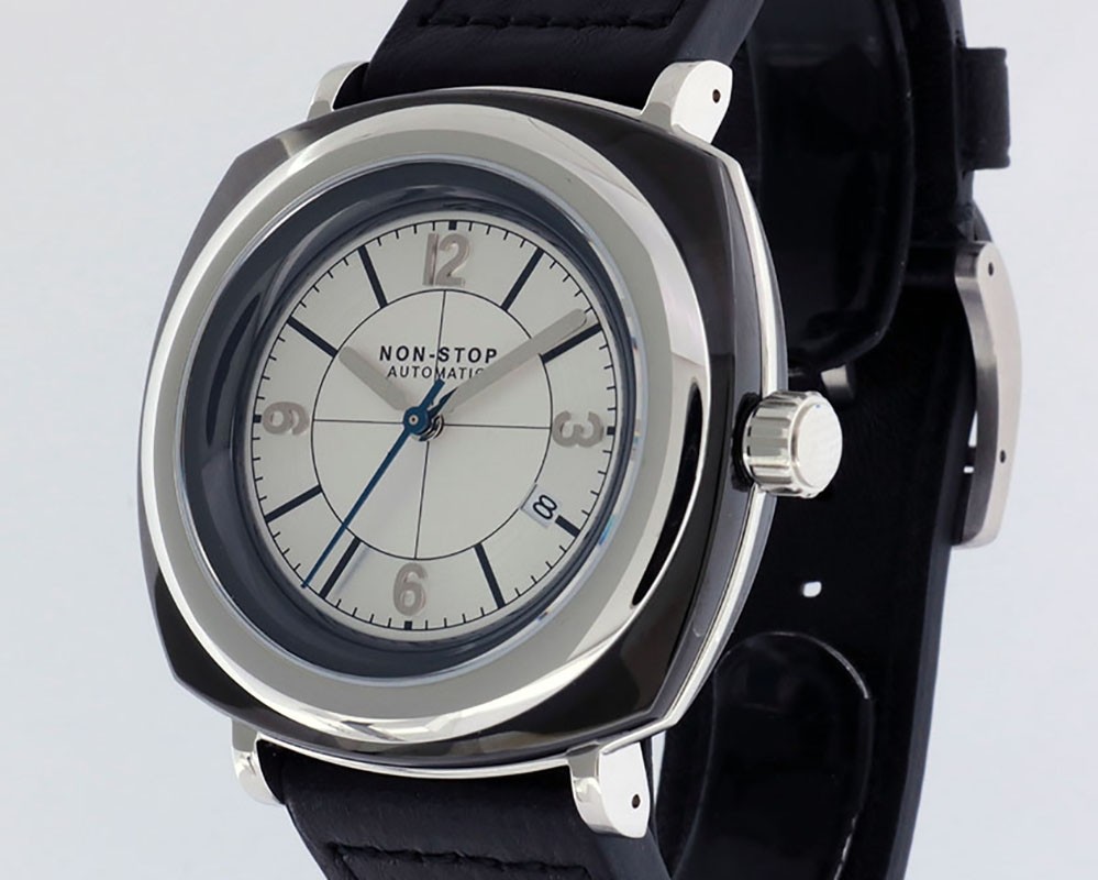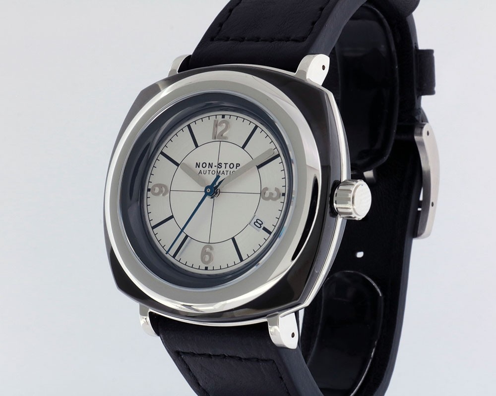Non-Stop Watches Cushion Black Silver BSSS, Black T5 Surgical Titanium Cushion shaped case, reserve up to ± 40hours. Silver dial, date. Black Italian leather quick release strap with Non-Stop Tang buckle, plus 2nd rubber strap.| Brand | Non-Stop Watches |