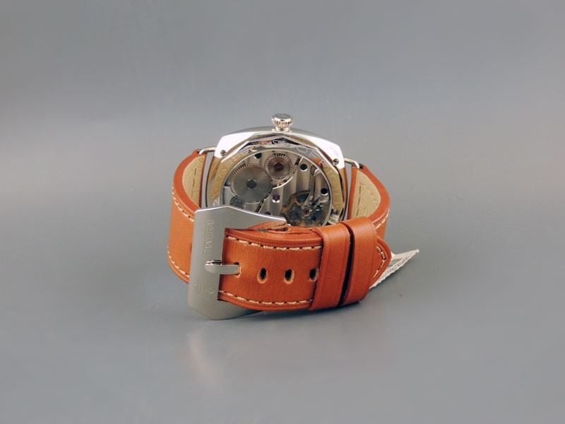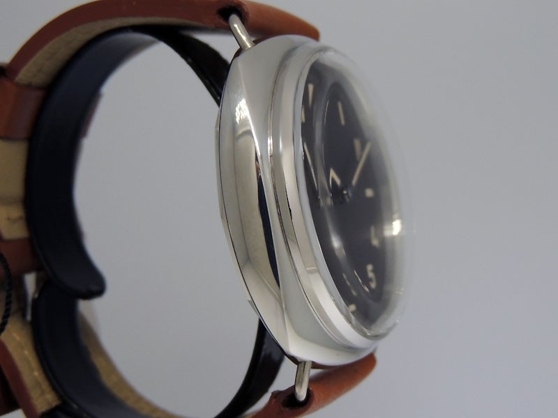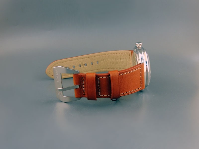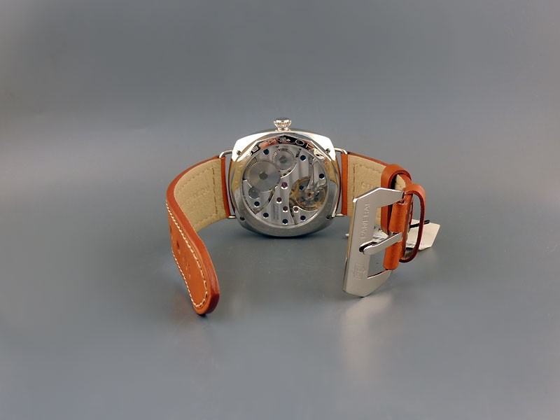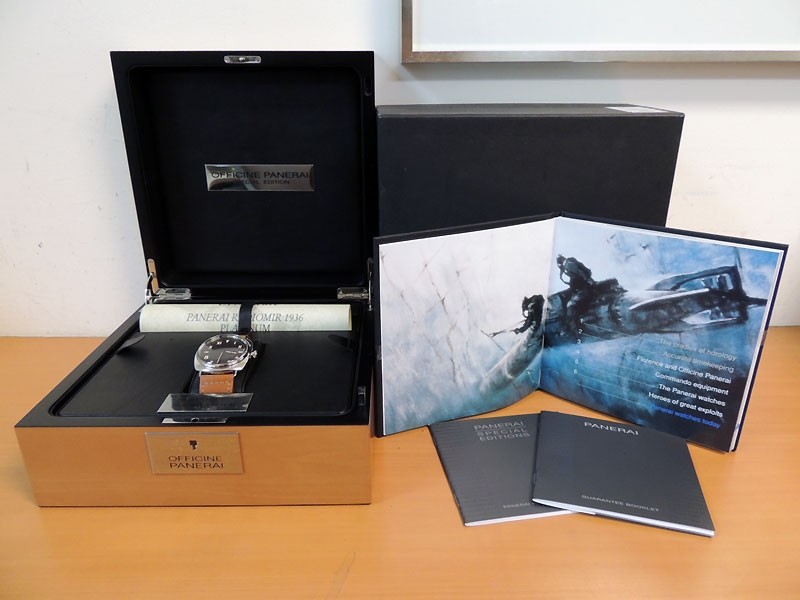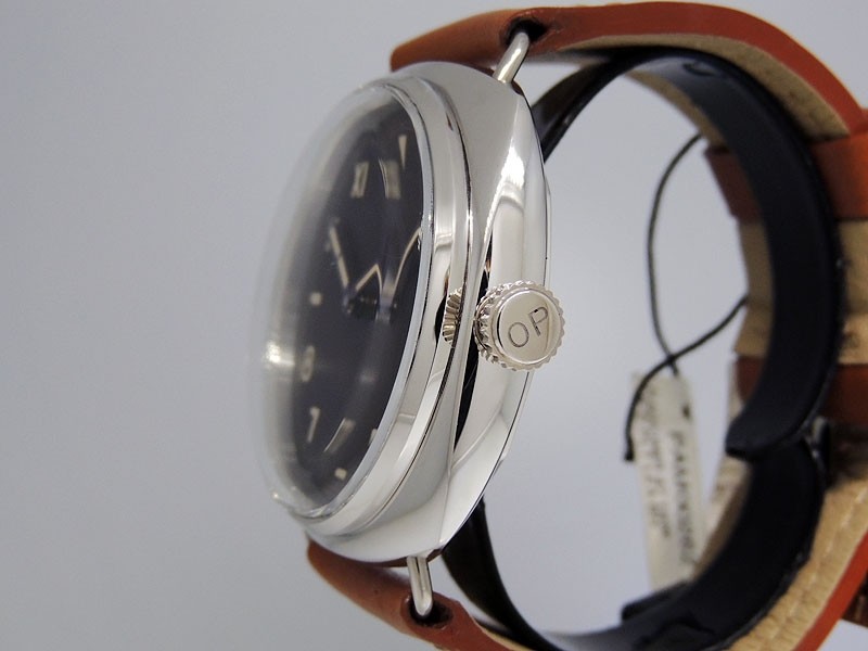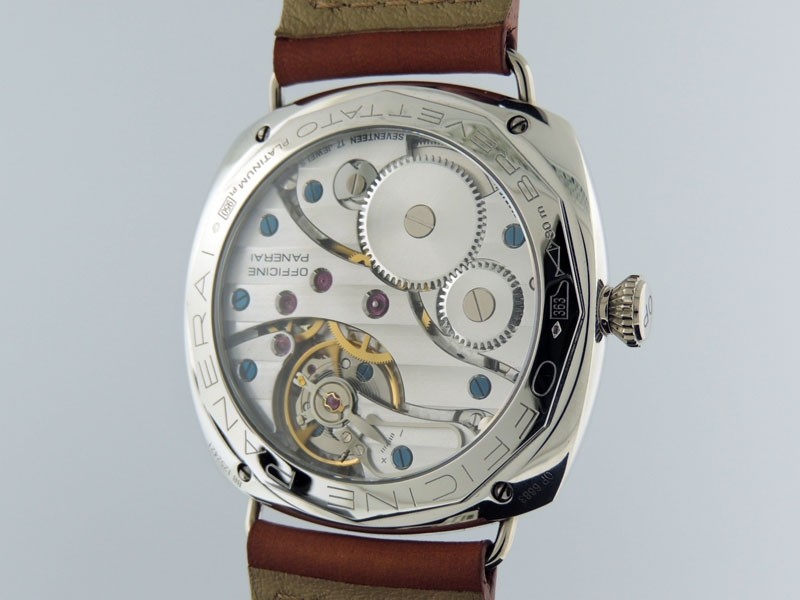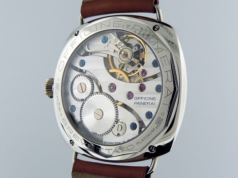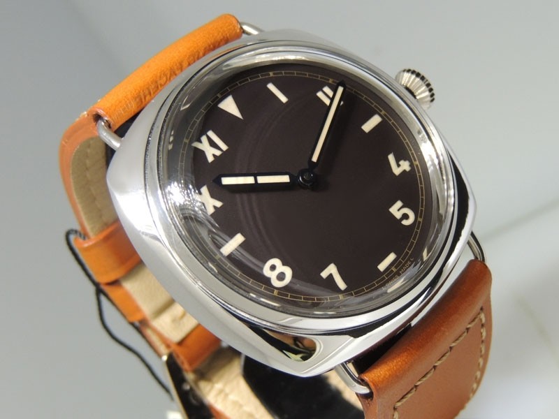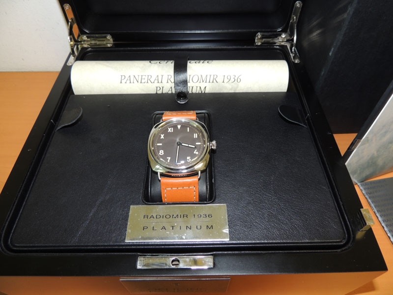 Swiss made Remake of Radiomir 1936 Brevettato crafted Platinum oversized cushion-shaped three-body case,reserve to ± 56h.Time only Brown ''California'' dial see photos, Brown Calfskin Ecru Stitching leather strap with large Platinum Panerai Tang...| Brand | Panerai |