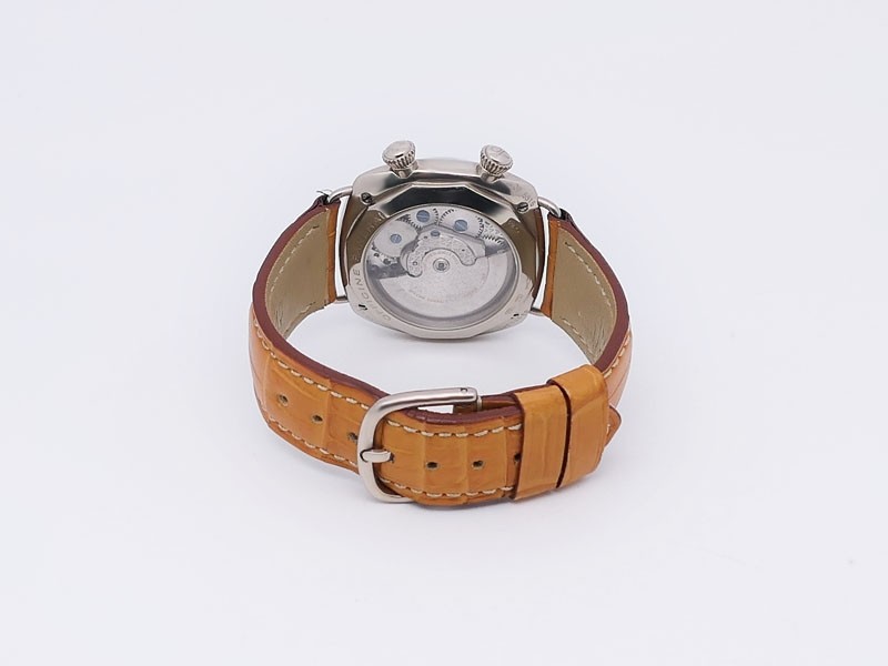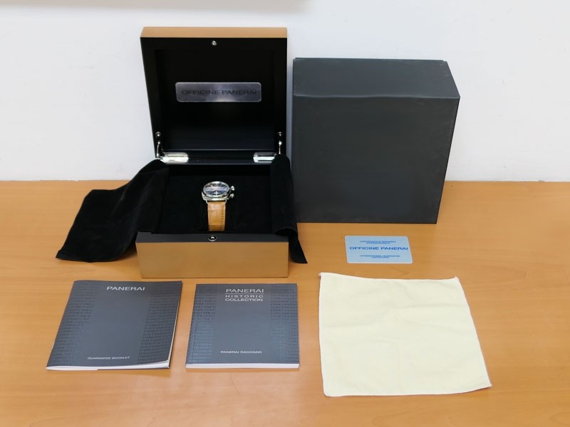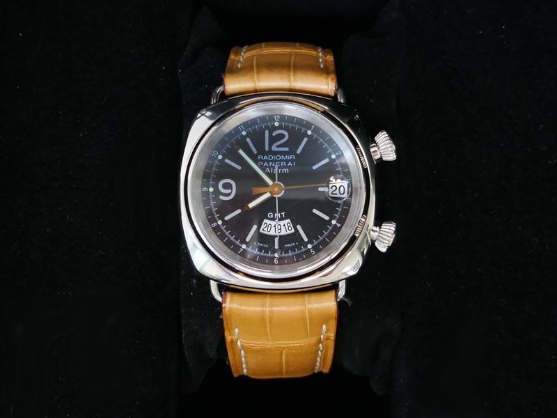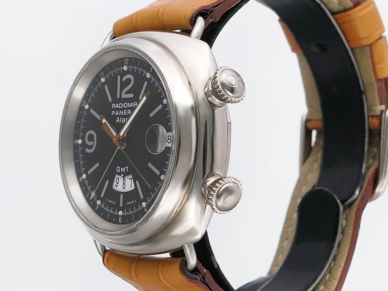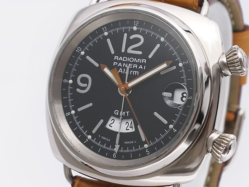 Swiss made 1999 Radiomir OP 6516 GMT Alarm crafted polished 18k White Gold solid three-body Cushion shaped case, reserve to ± 47h. Black matt dial with date, 2nd time zone, Alarm. Brown leather strap with Tang Buckle.| Brand | Panerai |