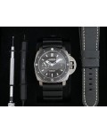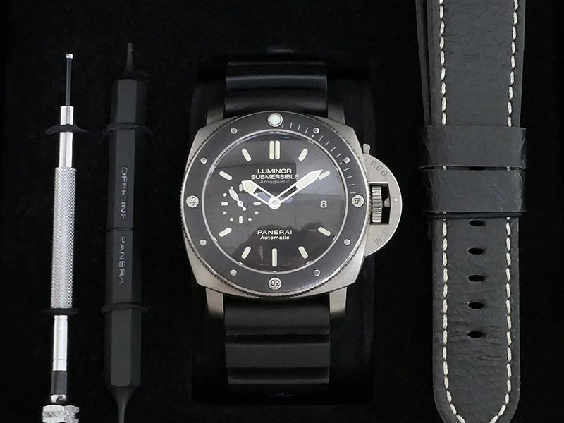 Swiss made Luminor Submersible Amagnetic cushion- shaped case, Black rotating Ceramic bezel, amagnetic cage, reserve to ± 72h. Black dial/ recessed running small seconds, Date. Black Rubber dive strap/Titanium Tang buckle + Leather strap & tools..| Brand | Panerai |