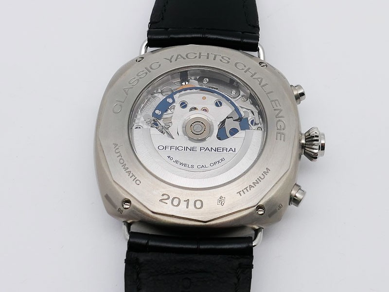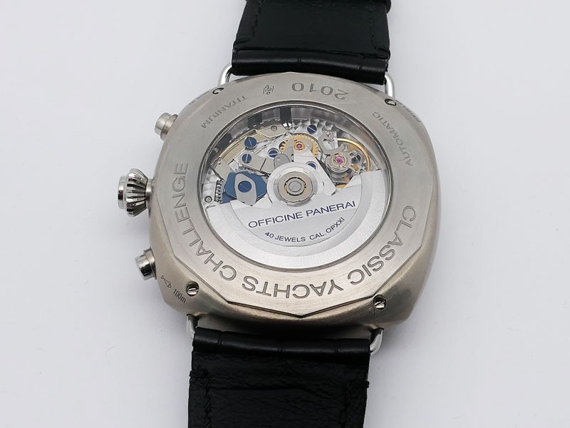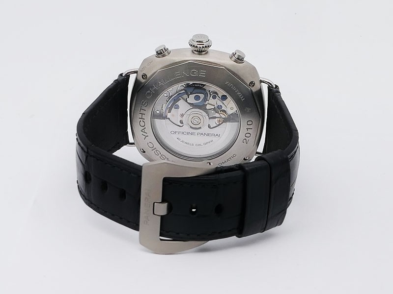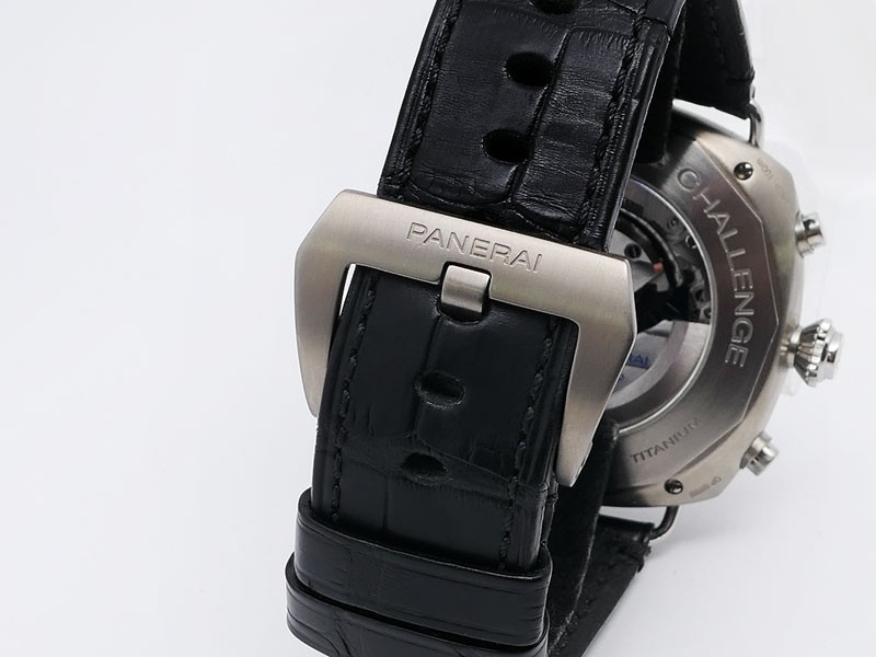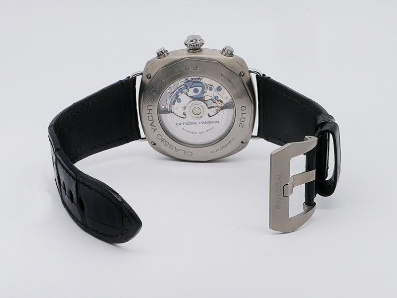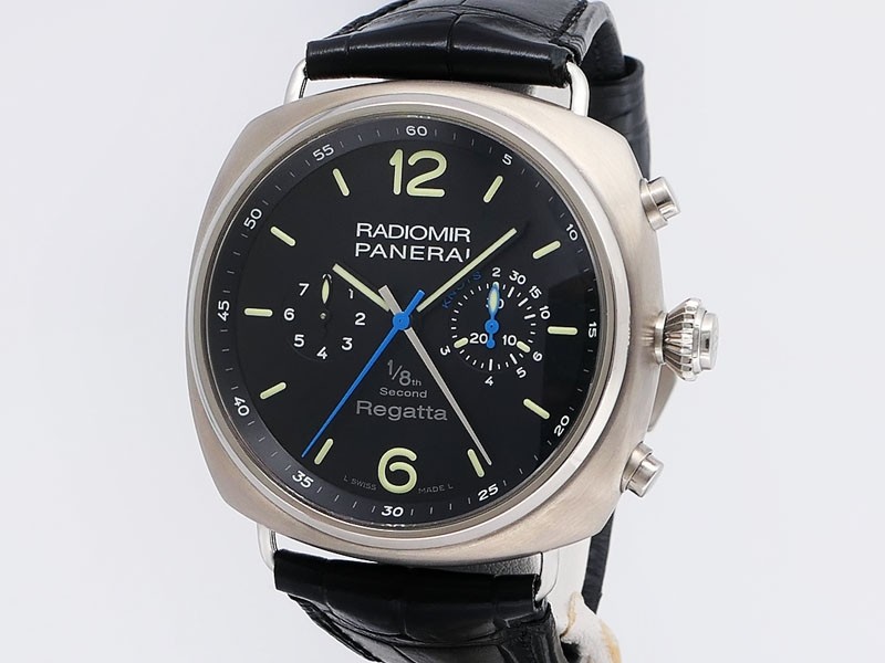 Swiss made Radiomir Regatta One Eight Second Classic Yacht Challenge, Titanium cushion shaped case, reserve to ± 42h. Black dial, Hands/ hour Indicators. Foudroyante, 1/8TH Split-Seconds Chronograph. Black leather Monte Carlo/Stitching Strap/Tita...| Brand | Panerai |