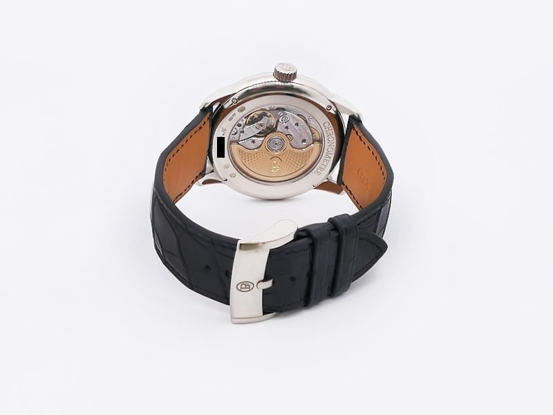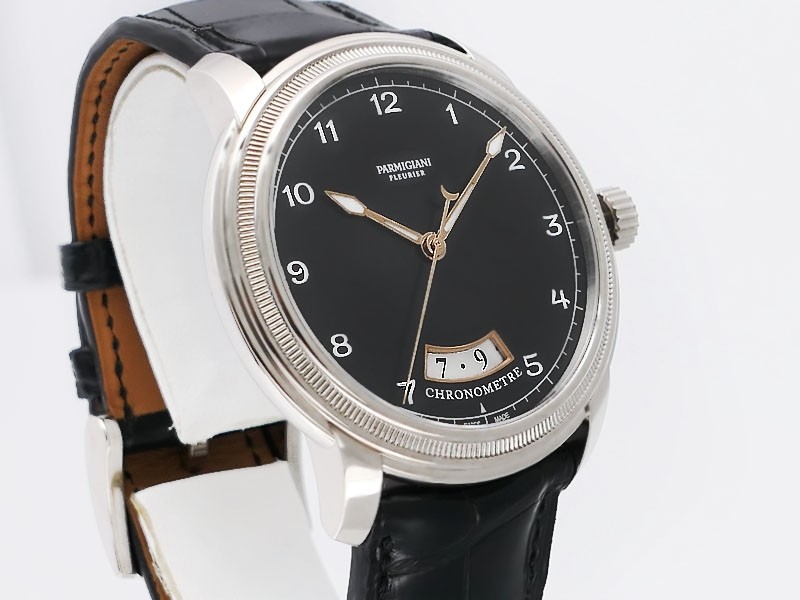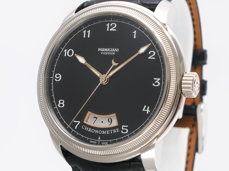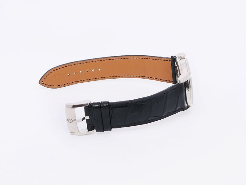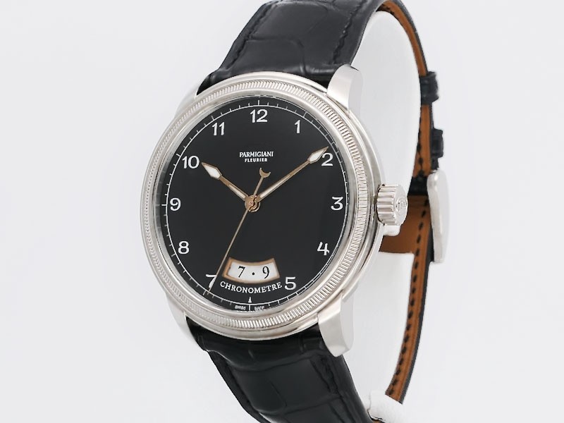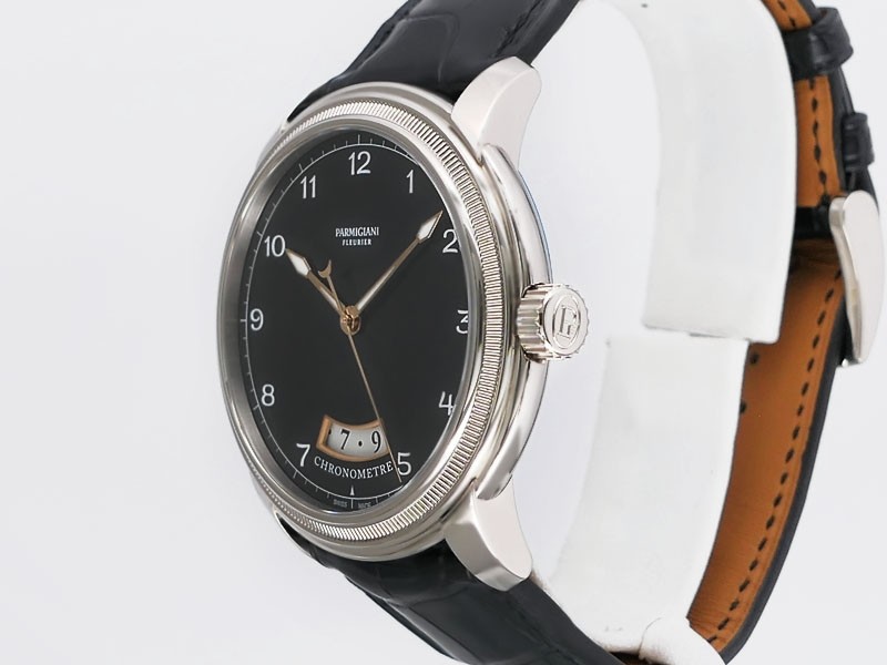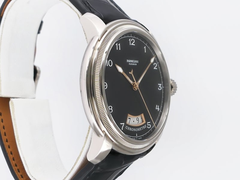Swiss made Toric Chronometre crafted polished 18k White Gold round shaped coin edge case, reserve to ± 55 hours. Black Opaline dial with Arch shaped date, Black alligator leather by Hermès Strap with Pf Ardillon Buckle.| Brand | Parmigiani |