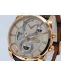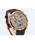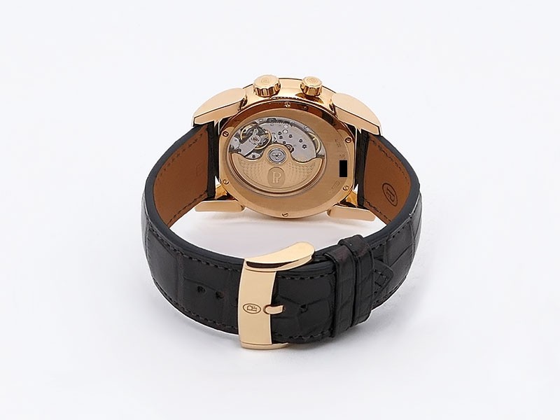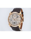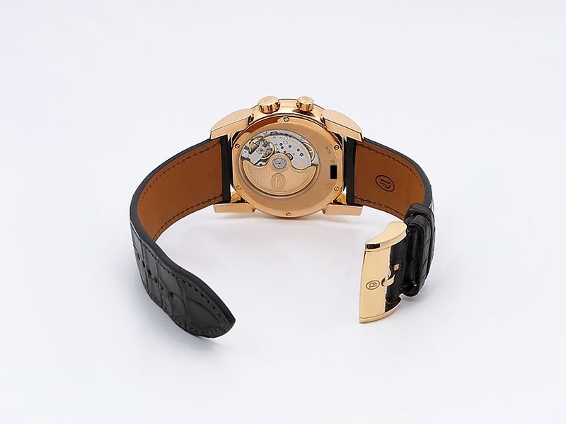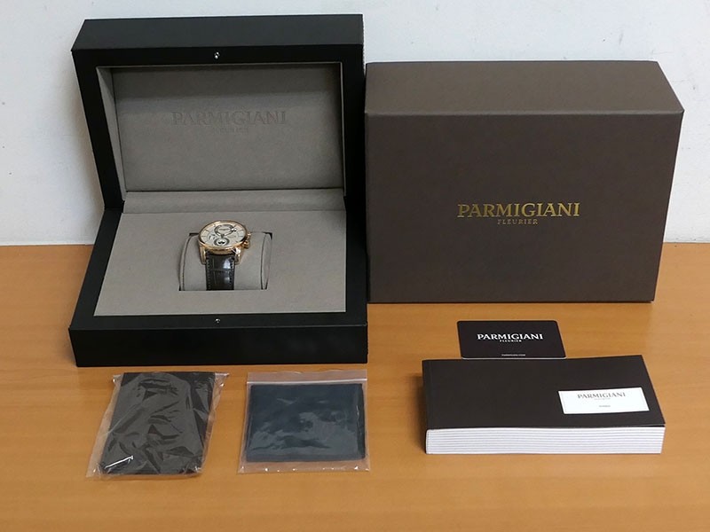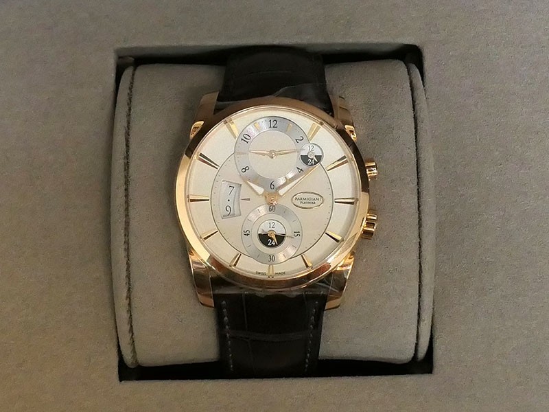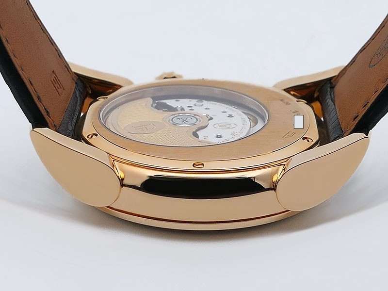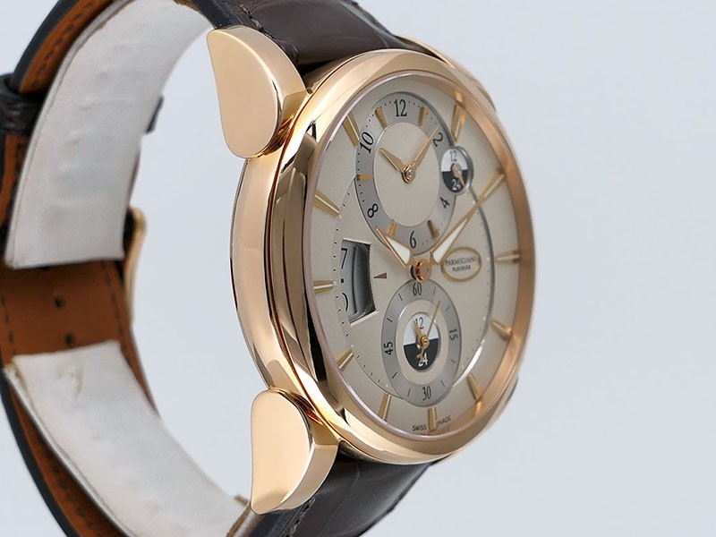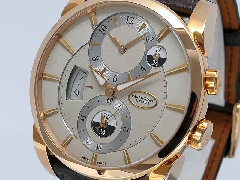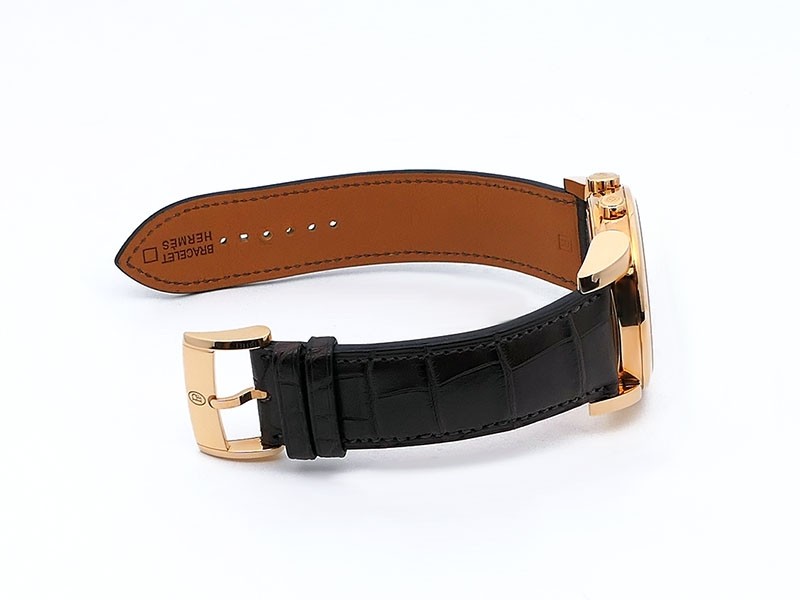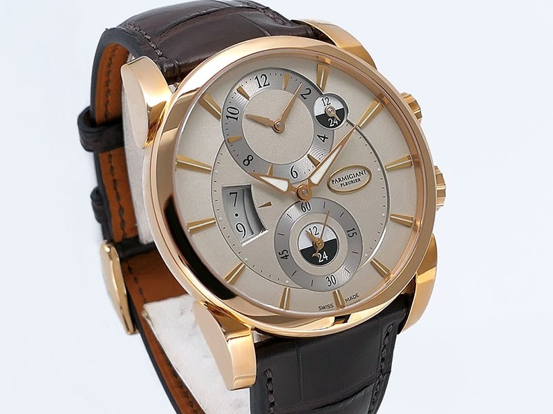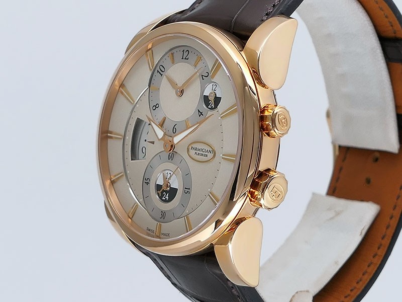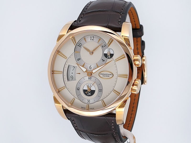 Swiss made Tonda Hemispheres Dual Time 18k Rose Gold round shaped case, reserve up to ±50h. Champagne finished two-tier dial w/ day/night , 2nd time zone, Date indicators. Brown alligator Hermes leather strap/ Pf 18k Roes gold Tang buckle.| Brand | Parmigiani |