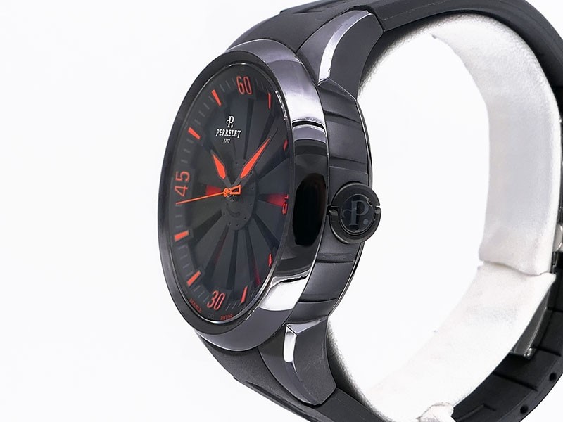 Swiss made Turbine Double Rotor A1047/1 in matte finish DLC coated Stainless Steel round concave-shaped case, reserve to ± 42h Black Turbine (12 Blades), Orange under dial (Spinning Turbine). Black Rubber strap/fold over, Push Button Release, DLC ...| Brand | Perrelet |