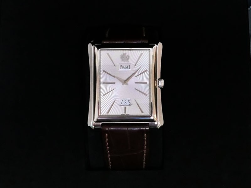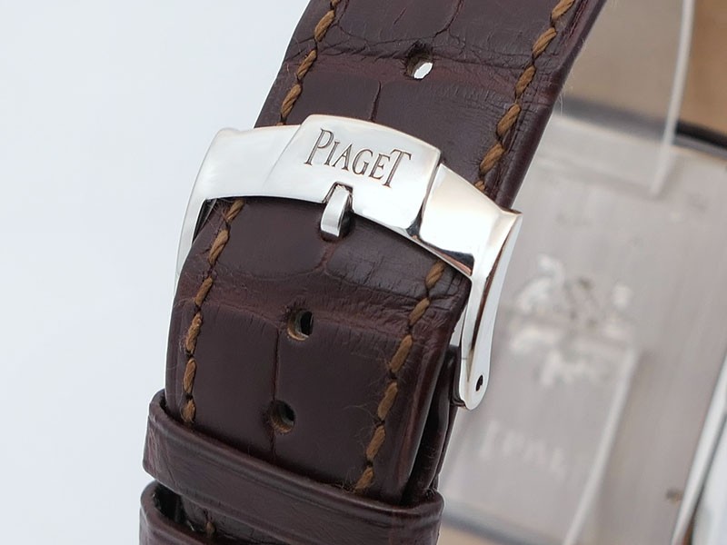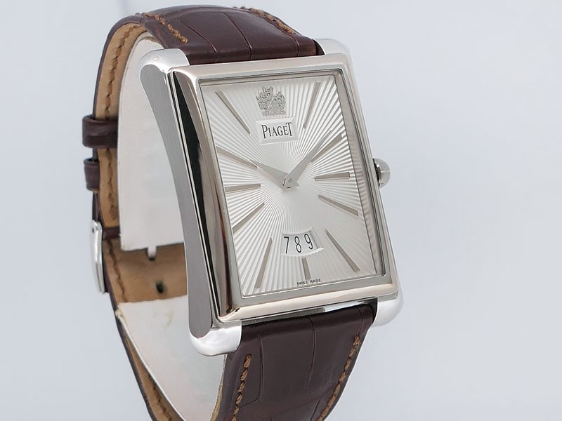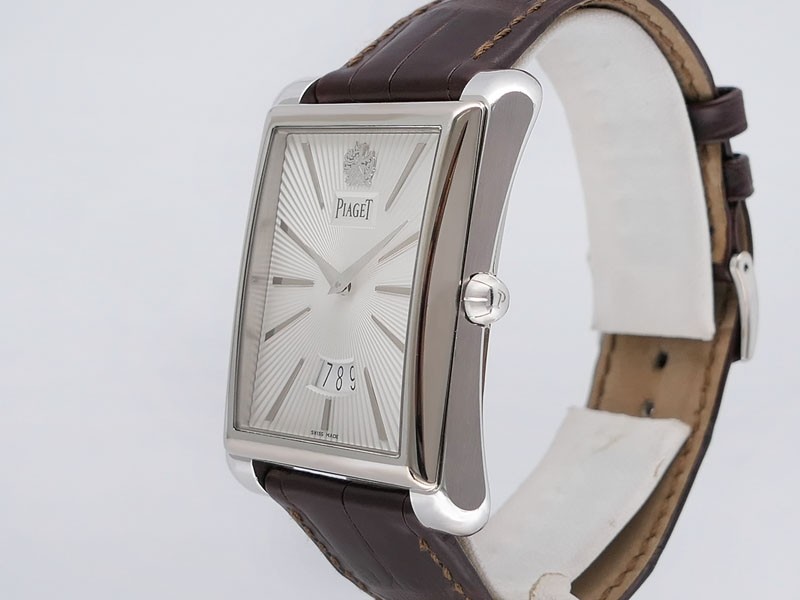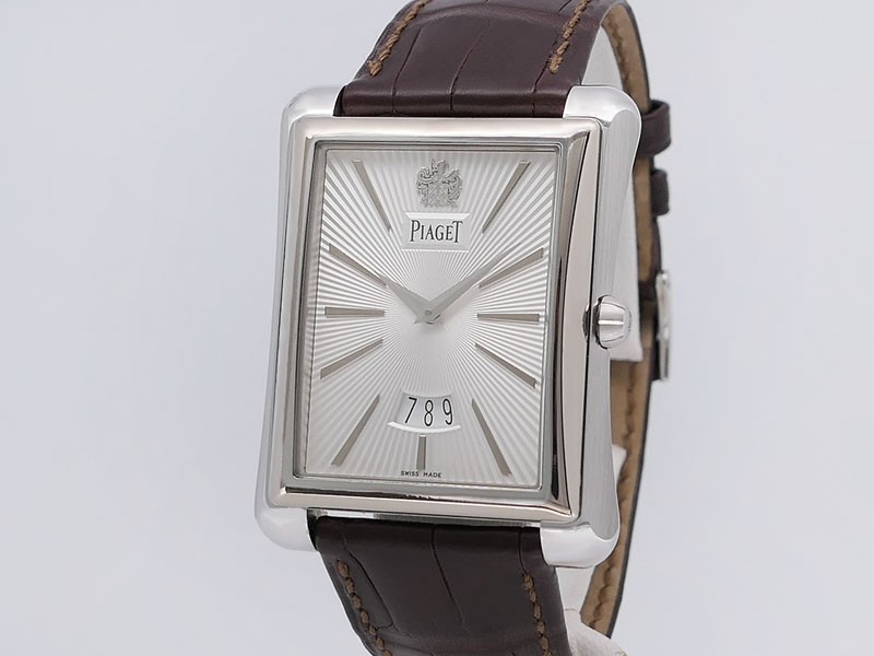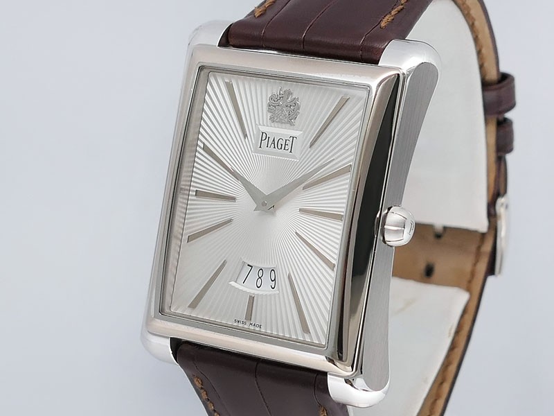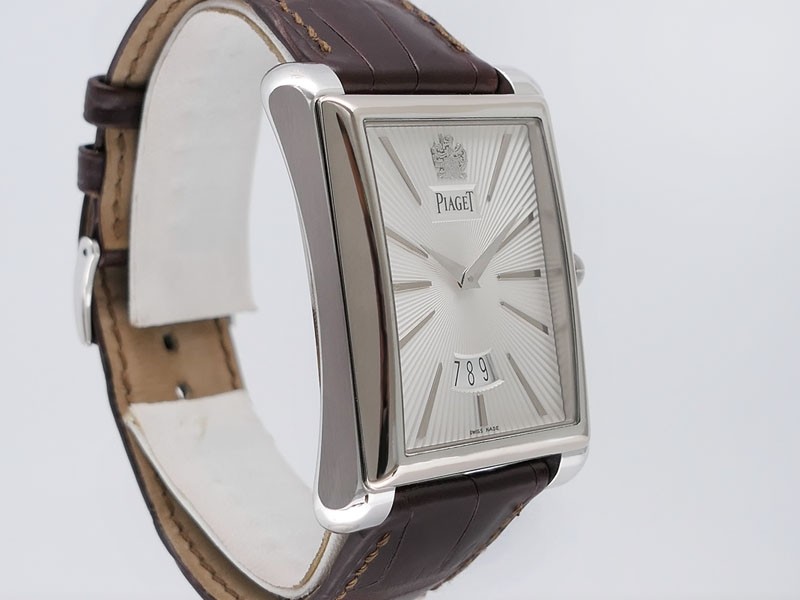Swiss made Emperador Date (PIO446) rhodium finish 18k White Gold curved Tonneau case, reserve to ± 42h. Silver sunray guilloche texture dial/w coat-of-arms in rhodium finish 18K White Gold, Date. Brown Crocodile Leather strap/ PiageT Ardillon ...| Brand | Piaget |