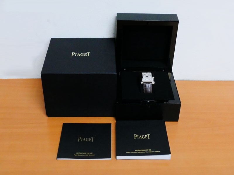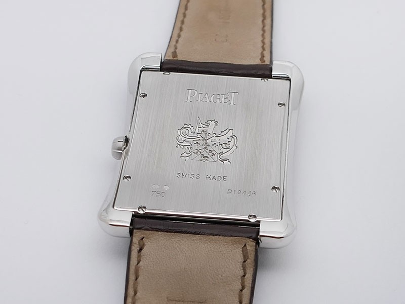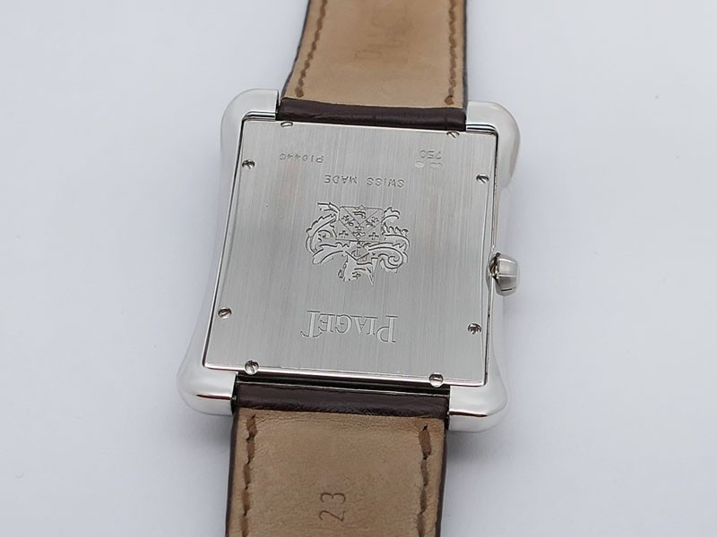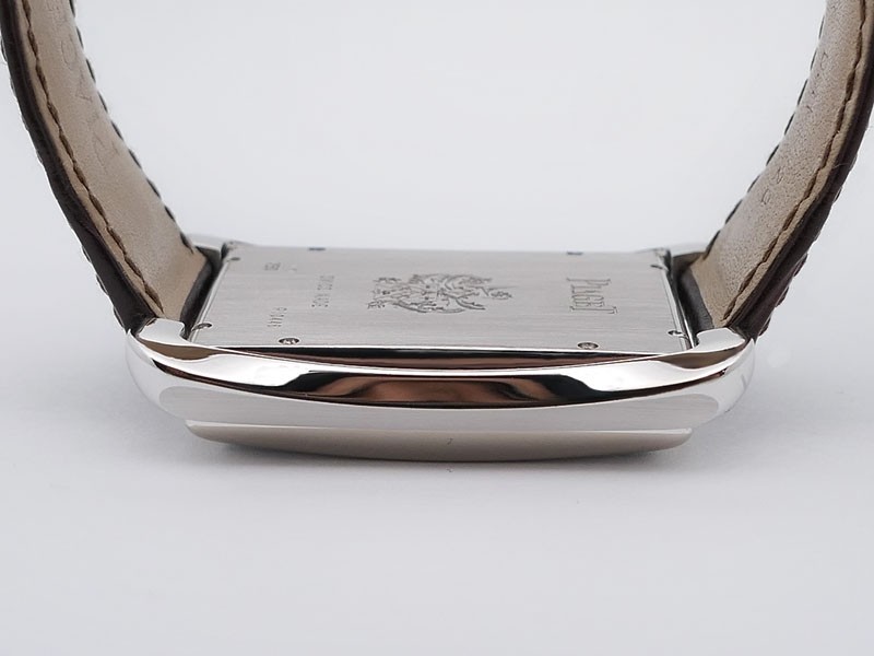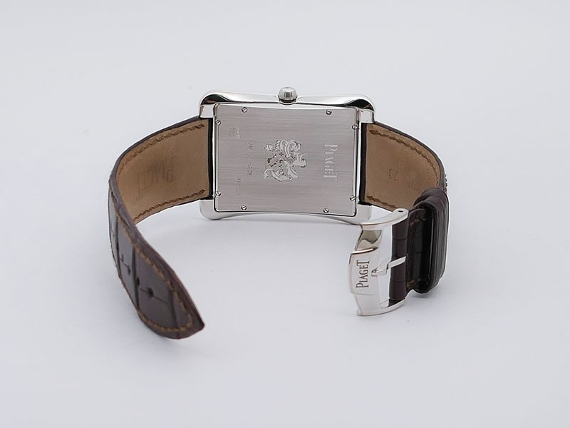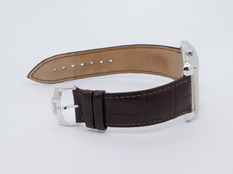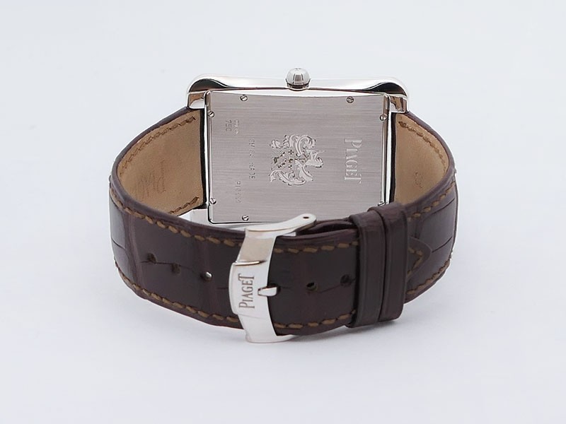 Swiss made Emperador Date (PIO446) rhodium finish 18k White Gold curved Tonneau case, reserve to ± 42h. Silver sunray guilloche texture dial/w coat-of-arms in rhodium finish 18K White Gold, Date. Brown Crocodile Leather strap/ PiageT Ardillon ...| Brand | Piaget |