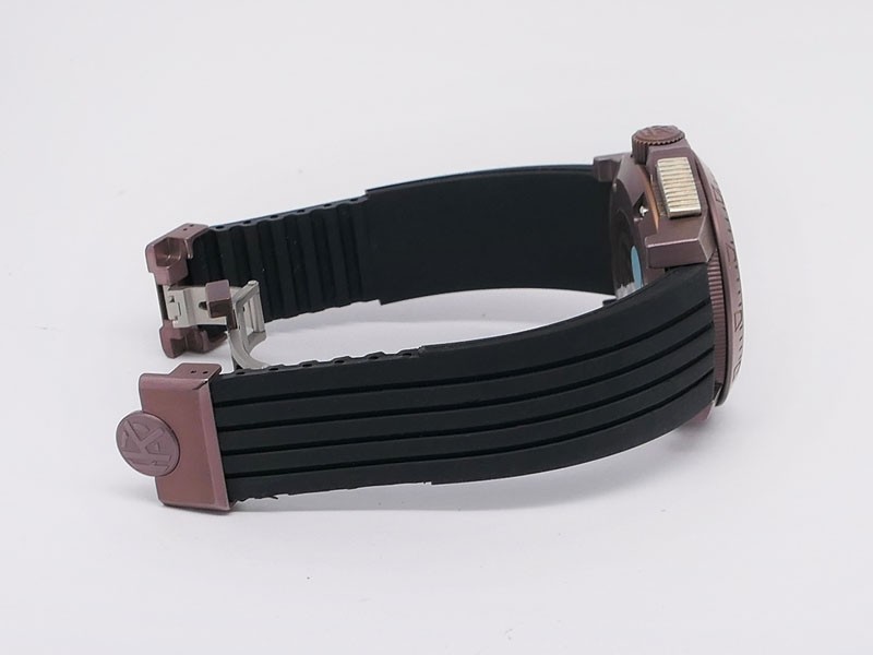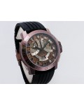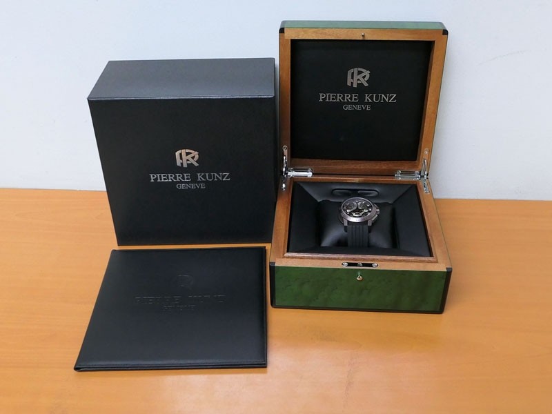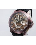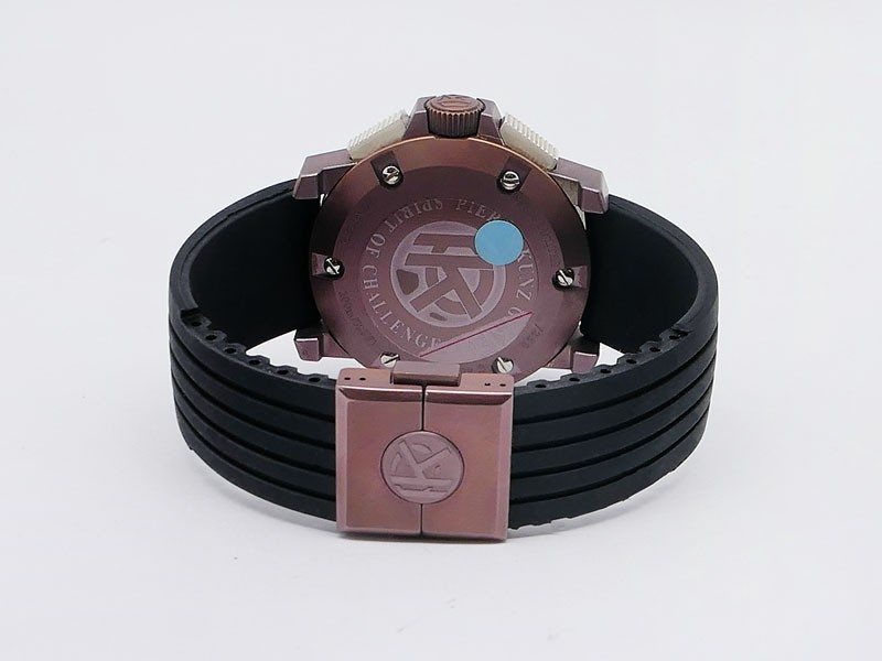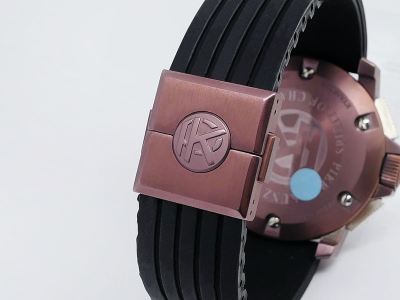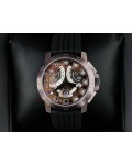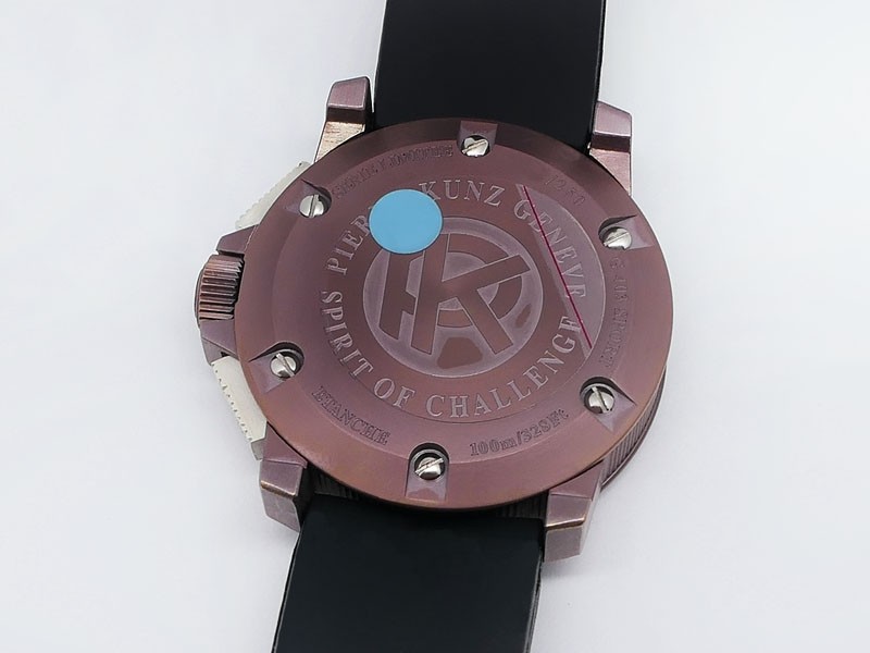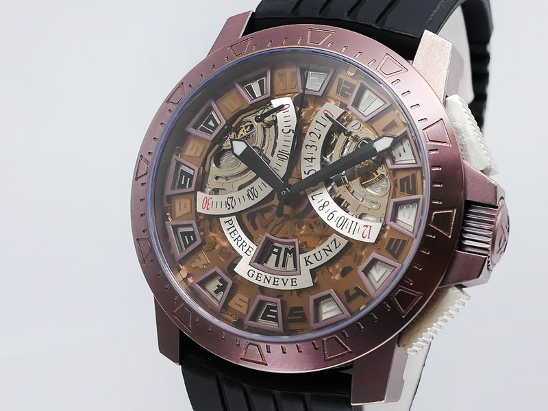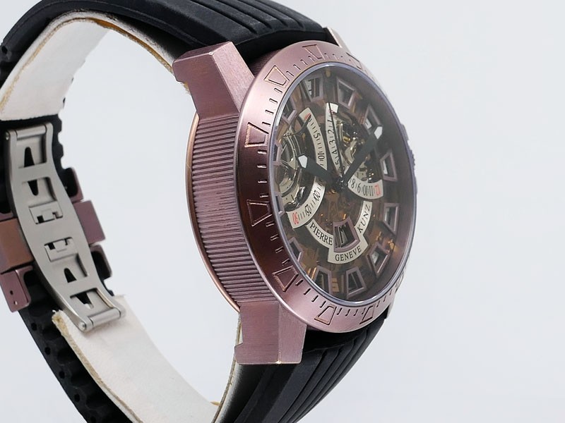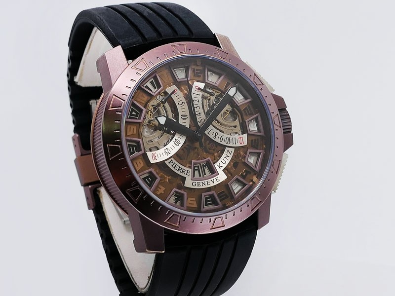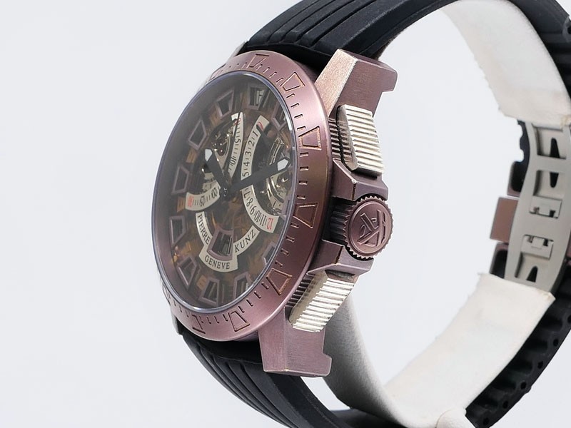 Swiss made Spirit Of Challenge, Bronze & Titanium round shaped case, reserve up to ± 42h. Skeletonised dial/ indicator AM/PM, Double Retrograde Chronograph Hours/Minutes registers, Black textured Rubber band/Bronze / Titanium butterfly double Dep...| Brand | Pierre Kunz |