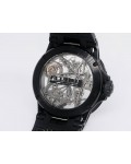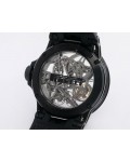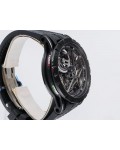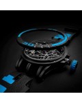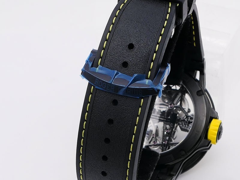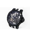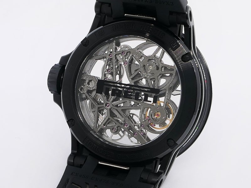 Swiss made Roger Spider Pirelli Black Titanium round shaped case and bezel, curved 3 lug design, reserve to ± 60h. Skeleton dial, Time only Pirelli Cinturato pattern strap,’ Black DLC titanium cover, deployment, External Kit Interchangeable/QRS.| Brand | Roger Dubuis |