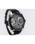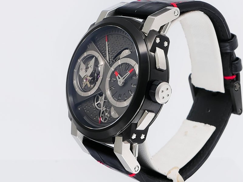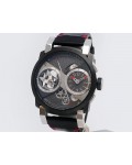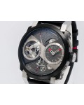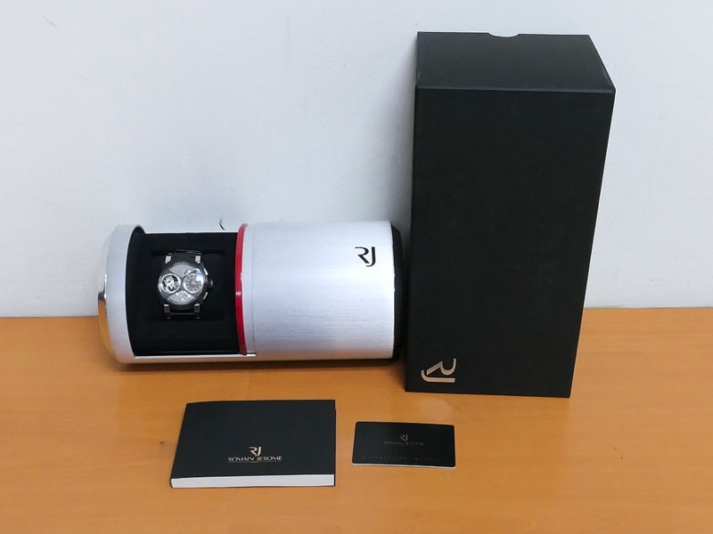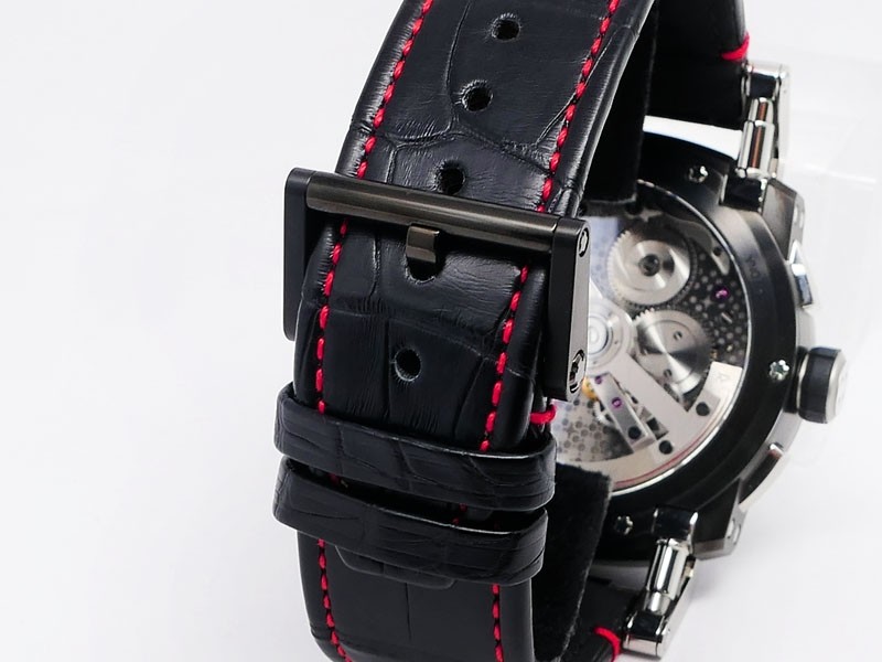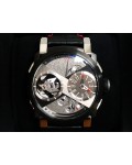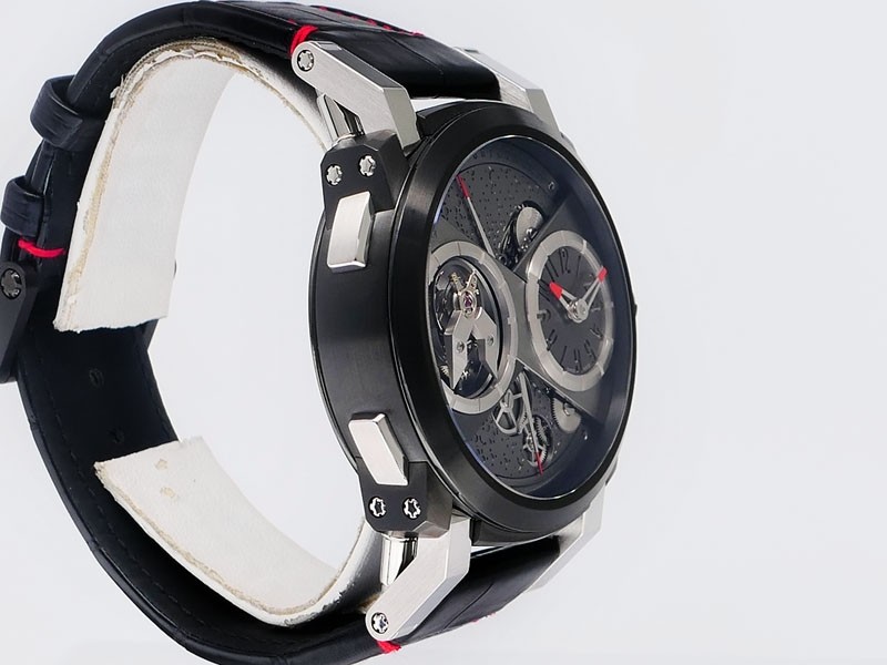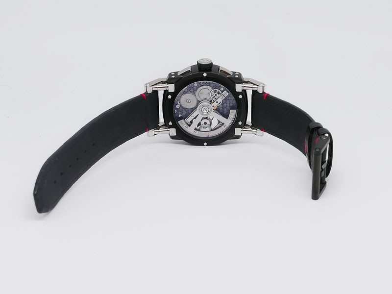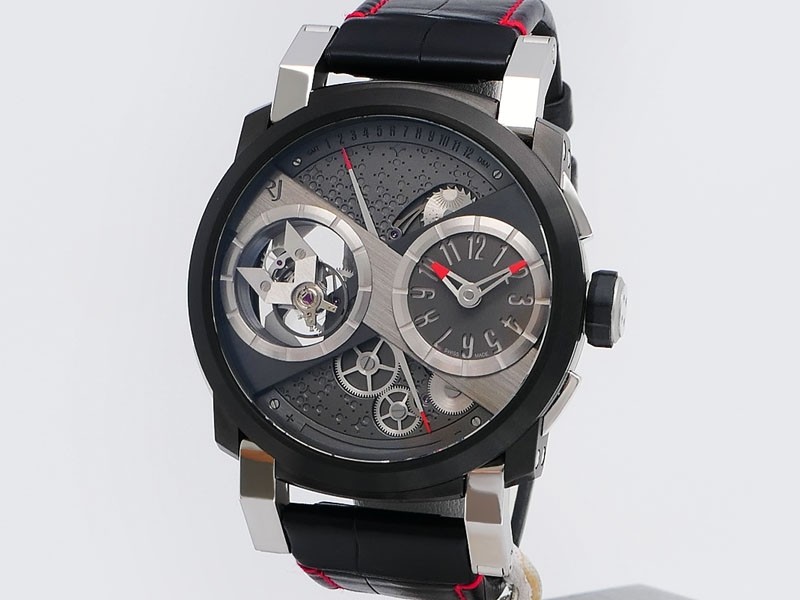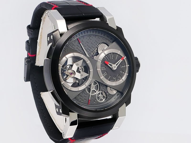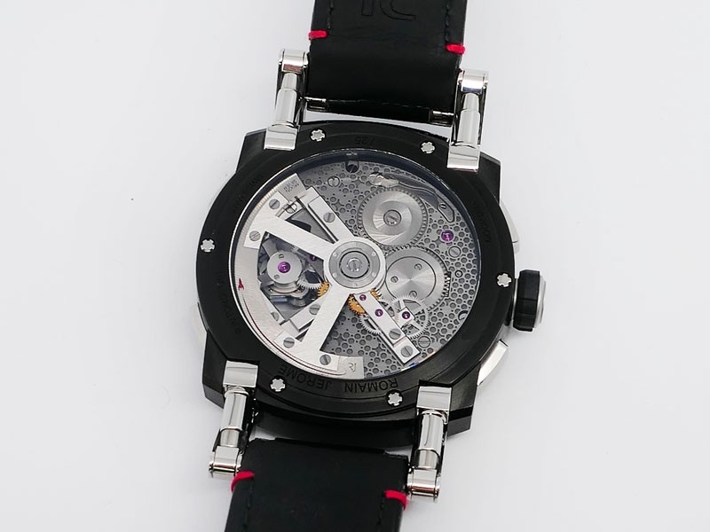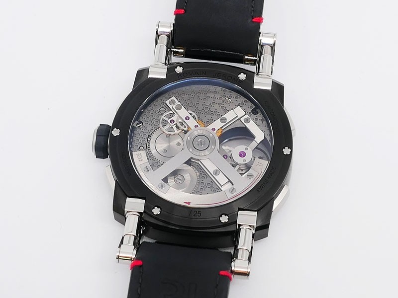 Swiss made Orbiter GMT Retrograde, steel containing fragments of Apollo 11 round shaped case, reserve to ± 45h. Grey dial, with Moon Dust w/laser engraved “stellar-patterned”, tourbillon. Black Alligator leather strap w/red stitching/ Black coati...| Brand | Romain Jerome |
